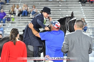 Next to the ring was the B split of Class 48, Owner-Amateur Two-Year-Old Stallions. Of the 26 entries, 11 were in the ring when Mark Farrar called to close the gate. Robert Cortner was the call judge as the class started underway at a flat walk. The densely packed class worked their way both directions around the ring. In the end, world championship honors went to Harvey Specter SBS and Janice Fostek, the owner and rider from Roanoke, Virginia. Sired by Jeronimo, Harvey Specter SBS adds this world championship title to wins at the Shelbyville Tennis Club show and the Money Tree Classic earlier in the season. The second-place award was given to The Street Lawyer and Taylor Walters for The Molly Walters Family of Rancho Mirage, California, also winning at the Wartrace Horse show a few short weeks ago. The Street Lawyer is sired by Lester H. Burns. Taking home third place honor in the class was The Bomb.com and Noel Botsch for Noel and Lynda Botsch.